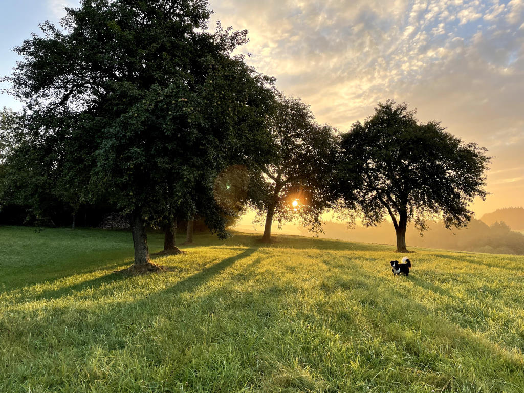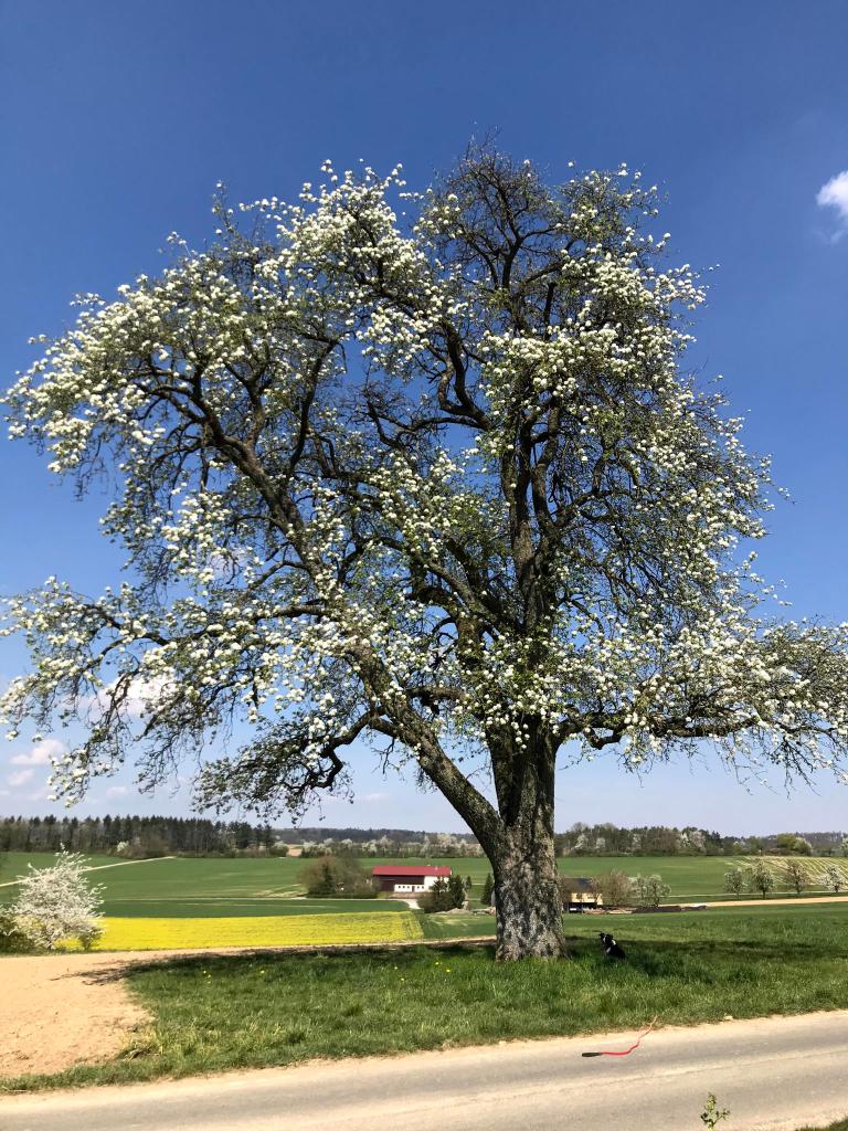Perry pear trees are virtually everywhere here, sprinkled across the landscape, and I was aware of them in a kind of passing way without considering what they truly represented. Walking with Anu away from the well-travelled roads, taking the Feldwege (field tracks) that are usually only used by farmers on their tractors, I was struck by the number of impressively large pear trees dotting the landscape. Of course, there were apple trees too, usually found as the occasional row surviving between tillage, or small stands and orchards. But the large solitary trees strewn between or sometimes standing in the middle of fields tended to be pear trees. I began taking photos of them through the seasons. I bought a special tape for measuring the diameter and an app to roughly estimate the age range. I began to choose walking routes I’d never taken just to see if I would find another pear tree hidden in a hedge or on the edge of a woods. And I usually did! So I began to map them and now have over 200 dots marking pear trees within a few of kilometres of the village. But more importantly, I was coming to realise that they were a mere skeleton of a landscape that was largely destroyed in the 1950s, in our region at least.