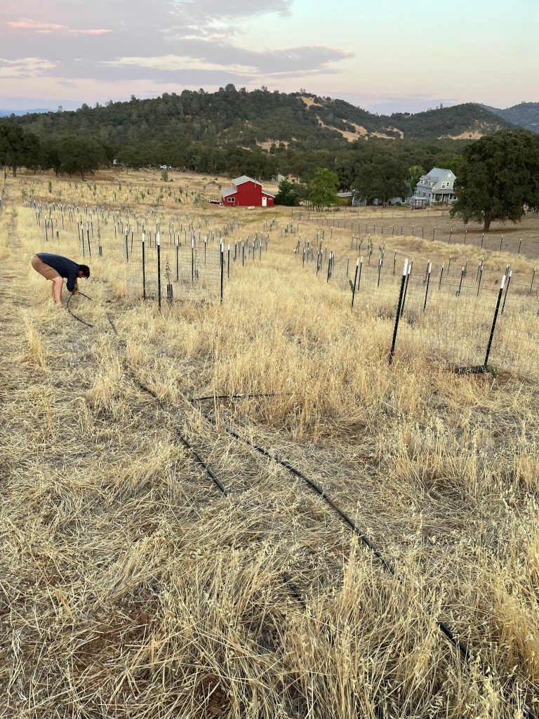 Brendan: The mature trees in the old orchards that we pick from are entirely unirrigated, but in our home orchard, we’ve planted around 2.5 acres with about 250 trees, and they range in age from brand new (planted this spring) to about four years old. They’re not being dry farmed just yet. We’re still irrigating those trees to get them established. But our goal is to start with the regulated deficit irrigation that’s becoming more popular in the wine industry, and start moving towards dry farming the trees when they reach about ten years old. Once they’ve got that root base established enough to insulate themselves from the heat, we’ll start to withdraw water more and more. We’re already minimally irrigating. In California, most of the irrigation is flood irrigation, where they open the canal, dump 20,000 gallons of water over an acre, let it soak in and evaporate. The evaporative losses are huge. When it’s so hot, you’re losing 80% of your water to the air. It’s very wasteful. So we do all of our watering via drip irrigation. I usually drip about a quarter of a gallon per hour per tree, for 18 to 24 hours. The aim is to get the deepest penetration that we can manage in a small surface area, to minimise water usage. If I’ve been running the irrigation for a full day, the trees have each received six gallons of water and the surface spot is maybe six inches across. All the rest of that water has gone straight down to the roots and will hopefully go to full use.