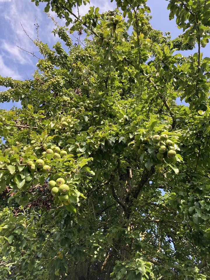 Gin is unmissable in the orchard, its clusters of brilliant, lime-green, ping-pong ball fruits, red-flushed at full ripeness, swarming and writhing up the branches of the tree like bunches of grapes on a vine. A Gloucestershire fruit, growing heavily — comparatively at least — around Newent, but popping up in orchards around the country.