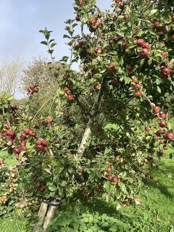 I’m curious as always about the growing conditions for the varieties. We’re right on the coast here, with a stunning southward view, and conditions I imagine get pretty rainy. But in this respect Killahora is lucky in its aspect. The steepness of the slope allows good drainage — so much so that Barry tells me trees they have planted in far-drier Norfolk struggle more for growth and ripeness than those here on Ireland’s south coast. Wind can be a problem for the taller trees towards the top of the slope; Dave points out a few that have fallen over, an annual occurrence, he tells me. But those further down seem, for the most part, to be staying strong. I’m struck by a passage I recently read in ‘Bulmers of Hereford: A Century of Cidermaking’ by Patrick Wilkinson, in which he describes Fred Bulmer attesting to never having seen better land for cider apples than in Ireland’s south-west. Judging by Killahora’s results thus far, he might have been onto something. Though I’m sad to hear that their Foxwhelp tends to struggle.