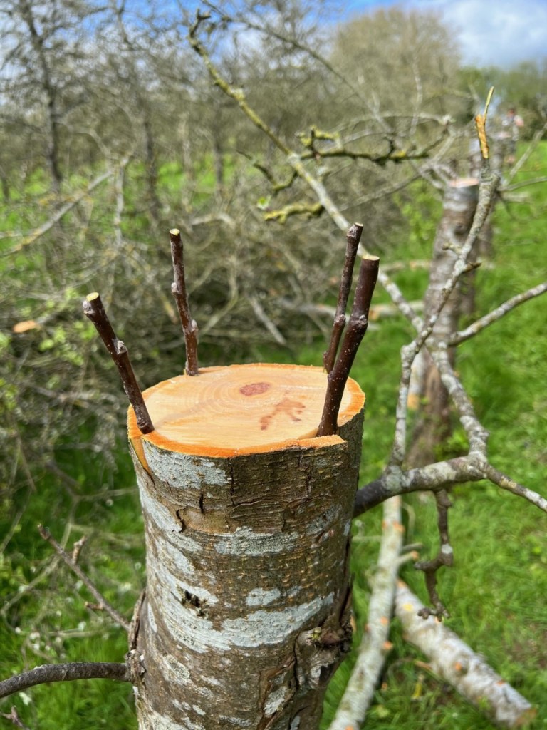 I’ve just returned from a long weekend at Broome Farm, meeting up with Albert Johnson and his Dad, Mike. Ross-on-Wye Cider & Perry Company is under their direction and leadership, and the UK Cider and Perry scene is much the richer for their astounding number of Single Variety releases in Bottle, BIB, and keg each year. It’s my third year visiting them in Springtime, and why do I go at this time of year you may wonder? Partly to marvel at the emerging apple blossom. Partly to soak up the atmosphere of this special place. Mostly to help with their top-grafting project. We use little cuttings from different varieties of apple trees, and after a bit of chainsawing and precision penknife work on the original tree, bond this new variety to the top of the original and create a clone. I started helping out with this work in 2021, and just like that walnut tree I mentioned at my parents’ house, it brings me great satisfaction to see a 90% success rate on the grafts I’ve helped with so far – seeing them grow from 10 cm sticks the year they were first grafted, to 2m – 3m high shoots, proudly growing towards the sun, and in a few years’ time producing apples for Albert and Mike!
