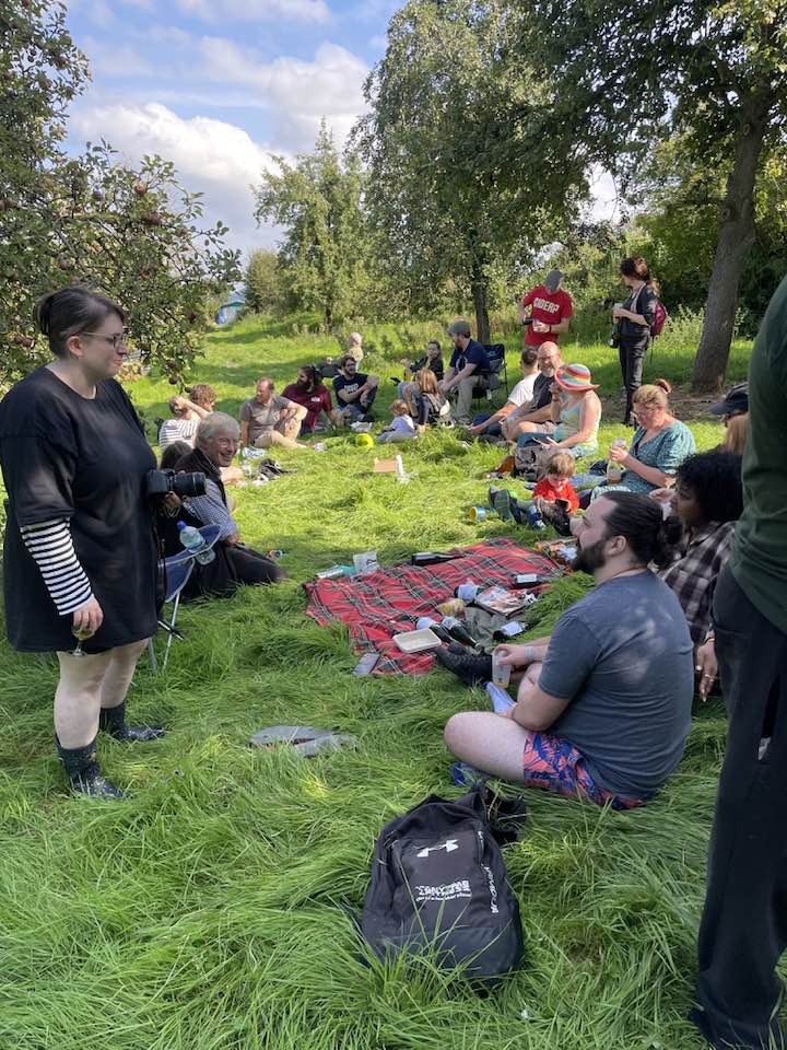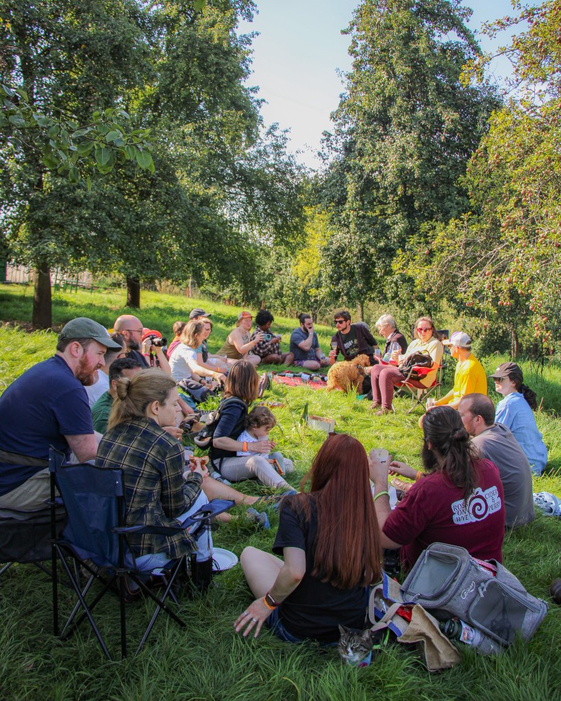 I thought about groups and belonging on Saturday this year, as the handful of us that had pottered over to an unofficial bottle share in the Perry Pear orchard spiralled into over thirty people, not one of whom had met everyone else there before; most of whom aren’t professionally involved with cider or active participants in online cider discourse. Some of whom hadn’t tried full juice cider at all before they first came to Ross Fest. All passing around bottles, all sharing conversation — some about cider but mostly just general chitchat under the shade of the Red Pears and the Hellen’s Early (I’ve finally learned the varieties in the Perry Pear orchard — apologies to Barry who I greatly disappointed when we walked it!)