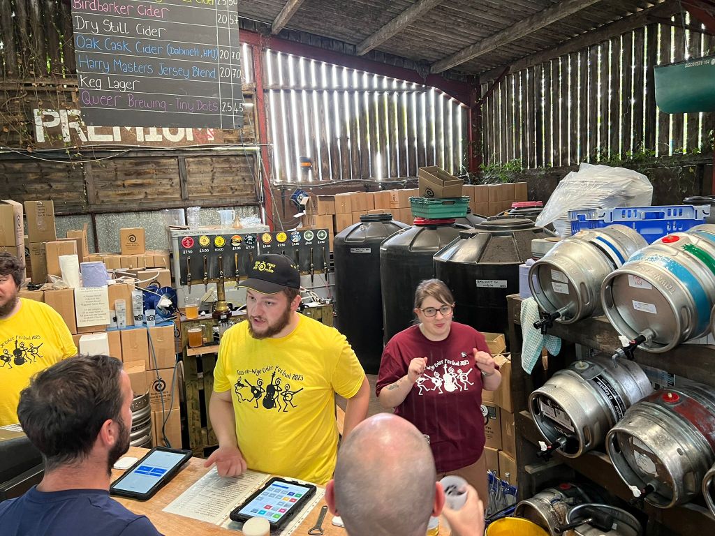 Finally, the social element. Be it behind the bar serving alongside some awesome fellow volunteers, up in the Perry Pear orchard sharing numerous bottles of cider and perry with folk from all over the world, or in-between the two cider barns propping up alongside a whisky barrel or at a table – this festival truly brings many likeminded people together for a long weekend, bridging the digital networks we have established and maintained over the last few years, and effortlessly transporting us all into a friendly, physical space. How Albert and his team managed to move all the stock from the Lower Barn into the Top Barn and still have space for us to serve is a marvel. And all of this just before harvest kicks off proper at Broome Farm. Here’s to the Ross-on-Wye Cider & Perry Festival 2023 and for many more to come!
