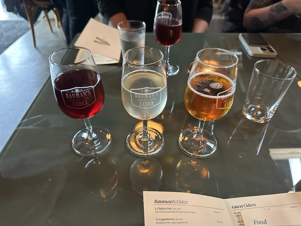Just behind the taproom, all polished concrete and wooden beams (and very cool tables created by Christine’s furniture designer daughter Hannah), is the production facility. Christine was kind enough to give us nerds a tour — glass in hand, of course. The large stainless-steel tanks and warehouse vibes contrasted with her description of her family’s farm, where the business started, and the smaller-batch Bauman’s ciders are made. It’s on the list for my next visit to the area.