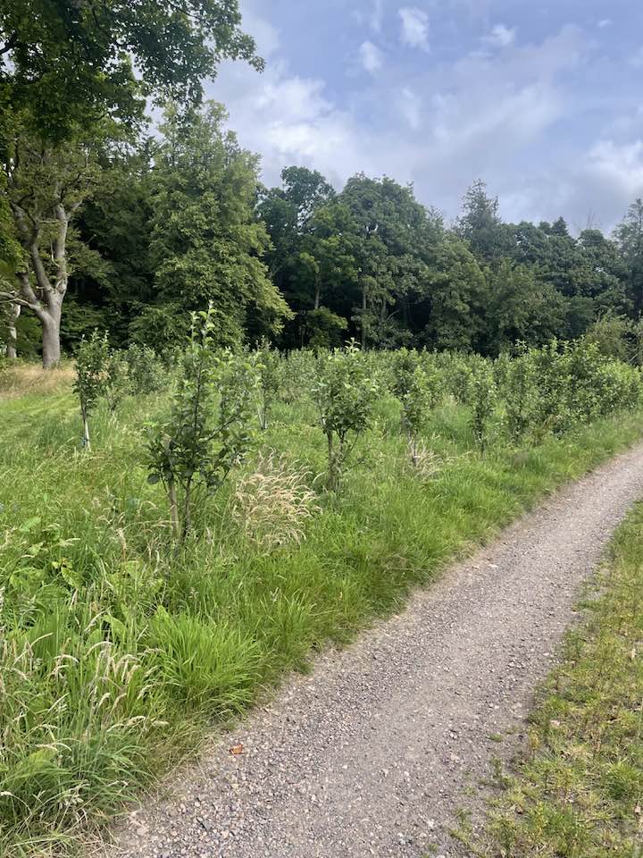 In the six years since Peter began his cidermaking project he has been busy. Every spare inch of space, or so it seems, has been filled with apple trees – and the areas that haven’t been yet are marked for future planting. There are 1500 trees in the ground already, all on south-facing slopes that form a beautiful natural amphitheatre around the farm buildings, protected at the crest of the hill by woodland. 900 more are due to follow.