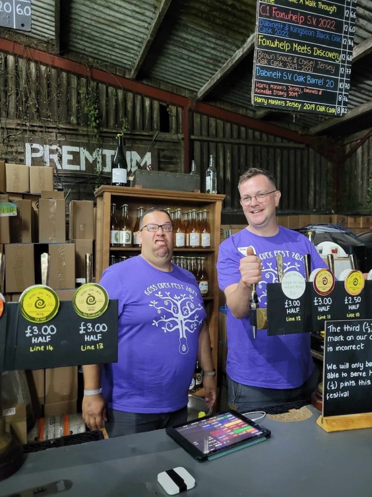 Back from 4 sunny days camping at Broome Farm and volunteering at RossFest24! There’s nothing quite like packing away a dry tent without the weather trying to interfere. I asked Albert to be on the late-night bar shift this year, so from 8pm to midnight each day I got to meet a large portion of festival-goers and try to piece together what was popular on keg and from bottle. One young couple approached on the Saturday night to say they’d never tried perry, but thought this was the right place to try something. They left with a 750ml bottle of the new Moorcroft SVP, then came back for a few more as the night wore on. After which they then jumped right into the deep end with the new Flakey Bark oak cask SVP. They liked both. It seemed like a case of the right palates, at the right time, with the right perries in front of them.