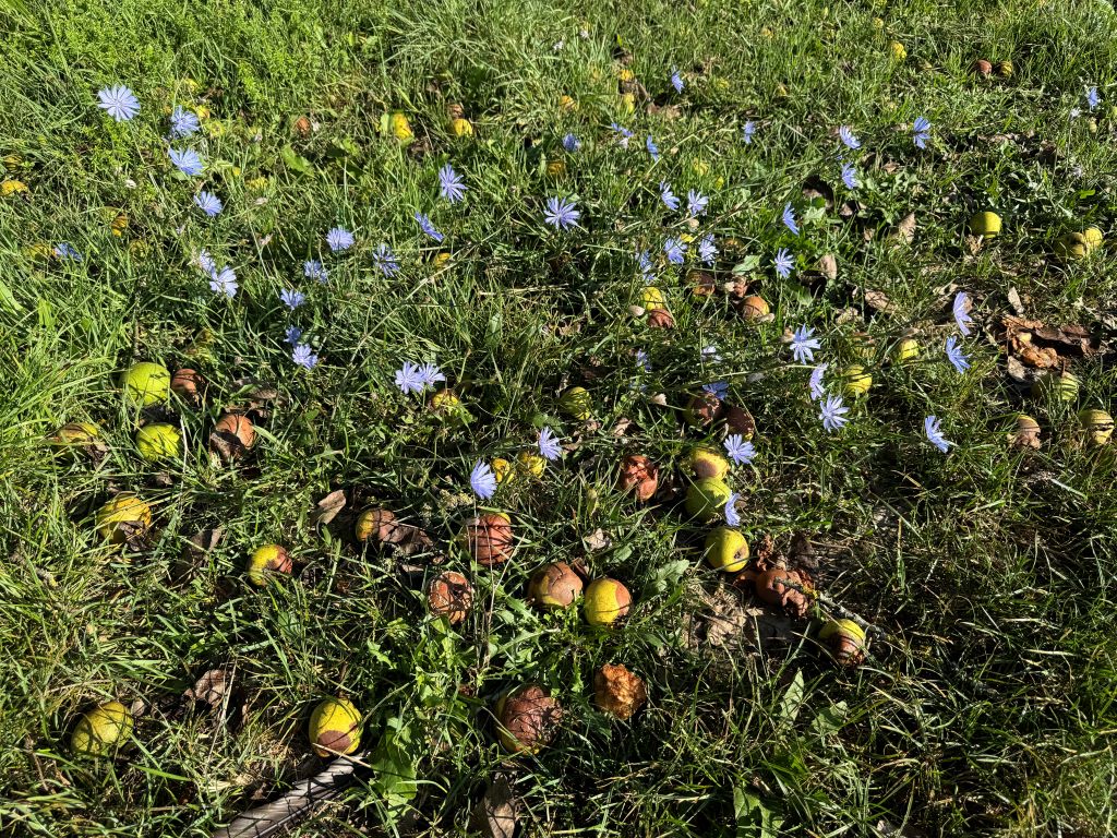 Over at Elfriede’s meadow, just a couple hundred metres east along the ridge, the three Schweizer Wasserbirne have practically no fruit. The April frost seems to have hit them harder there. One of the two Bayerische Weinbirne has literally nothing, while the other is looking pretty good. This may rescue this year’s single variety BWB. But the Gelbmöstler… they are nearly all down and turning into chocolate. I don’t understand it. This year had plenty of rain and wasn’t too hot, but they’ve fallen a couple weeks earlier than normal. I didn’t waste my time clearing the mush and mowing. I fear no Gelbmöstler SV perry this year. But there is another one at the seven sisters.