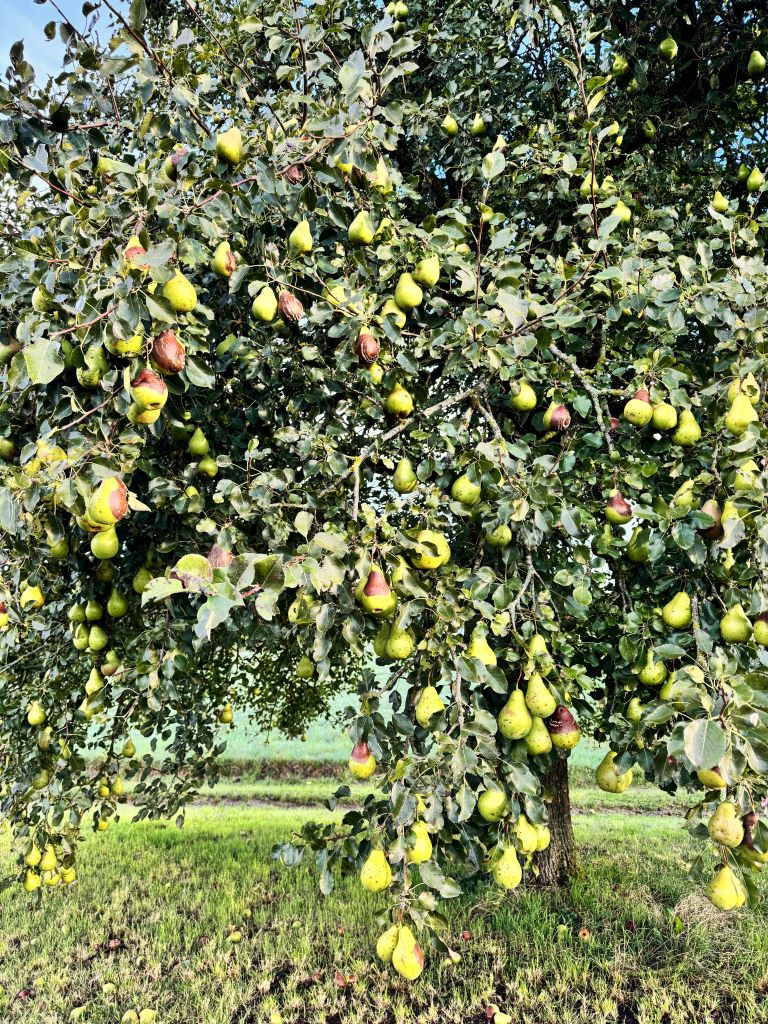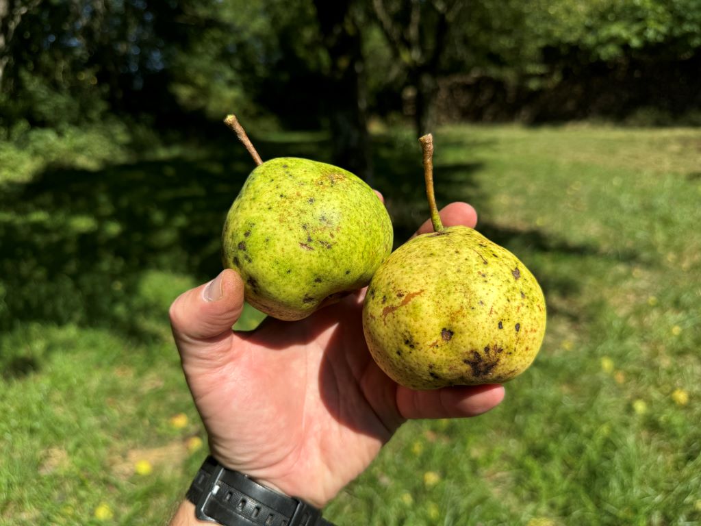 Ugh… These Welsche Bratbirne trees are hard to harvest at the best of times, standing on top of a bank, flanked by a ditch and road on one side, and tillage on the other. When Andy has had a summer grain crop in its great, the ground is tilled, so half the pears have a relatively soft landing. The ones dropping on the road are lost causes anyway. We turned up this evening to find the field is full of maize this year. We don’t fancy grubbing about in the maize, but it will be harvested soon. I hope the pears hang on a little longer. But these ones are mush in a couple of days, so we need to get as many as quick as we can and process them asap. God, I hate working with these pears, but they make an incredible perry. I really want to try to press them again having had to dump the 2023 pressing due to MLF. The tree near the orchard may offer salvation if the maize isn’t gone soon.