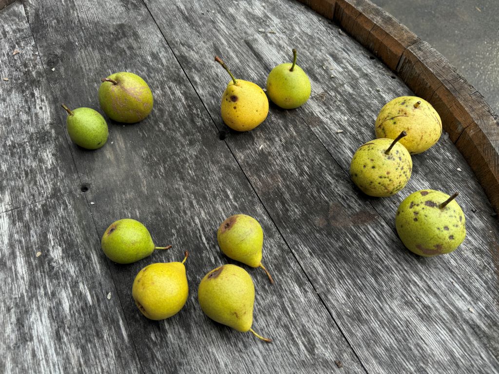 Often, it’s what I want to make that determines what trees we focus on. I always want Oberösterreicher Weinbirne, Luxemburger Mostbirne, Kirchensaller and Conference to make our annual Levitation blend. This year I am not sure we’ll make it. Even the Oberösterreicher Weinbirne, not usually harvested till mid-October, are falling in their droves and our main tree, what we call “tree number 1” (we name everything so we both know what trees we are referring to), is very light on pears indeed. It all seems upside-down.