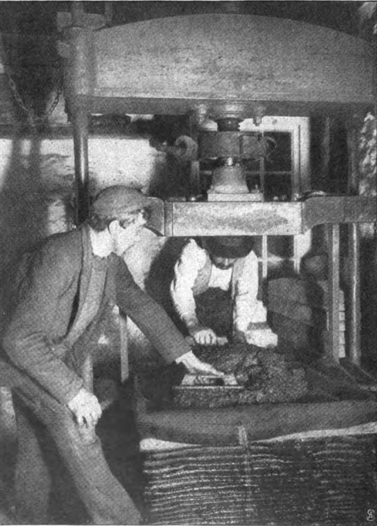 The technical process is very simple. The apples and the addition of pears, which is hardly avoidable to increase the sugar content, are poured into a large round trough with a concentric trough running around it and doused with water to soften them. Such a trough is as much a part of the home as the fireplace and the washroom, it is as much a part of the house as the window and door, and it can even be found in the yards of modest farms that have no fruit of their own. Because even these ‘disinherited’ people do not buy the indispensable cider ready-made; that would be against all sacred tradition.
