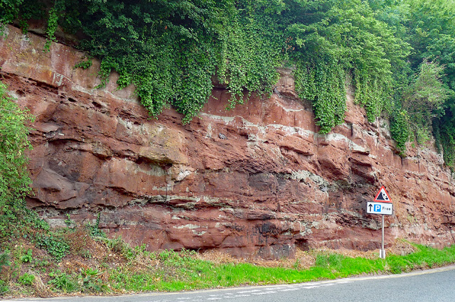 An exposure of Old Red Sandstone at Wilton Bluff, near Ross-on-Wye. The diagonal striations about halfway up indicate the flow direction (right to left) of the river in which it was deposited, while the green mottling is reduced iron (rather than oxidised red) indicative of ancient plant matter. Image by Stephen Richard (CC-BY-SA-2.0).