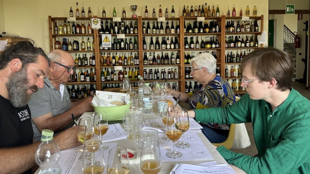 Most of those producers are situated in the traditionally apple-growing north. That’s where Alfie and I headed after the festival, spending a few days in Trentino exploring cideries in and around Val di Non (read more here). We also went over to Friuli in the far northeast. There, we were honored to participate, alongside local growers and makers, as well as our Italian cider guru Marco, in an all-day judging of fruit juices, ciders, and vinegars for the local apple association.