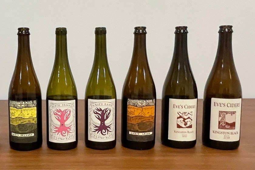 These are by no means all the expressions of Kingston black in single variety form that Eve’s has put out in its history. There are countless available from other producers in wildly different regions of the world as well. Given that we happened to have these particular bottles on hand, and that Eve’s admirable efforts in putting them out just begs for them to be experienced in vertical-horizontal-flight mode (helicopter mode?), I decided to really focus in on this one variety from one cidery and see what appears over different years and in different microclimates on the same farm.